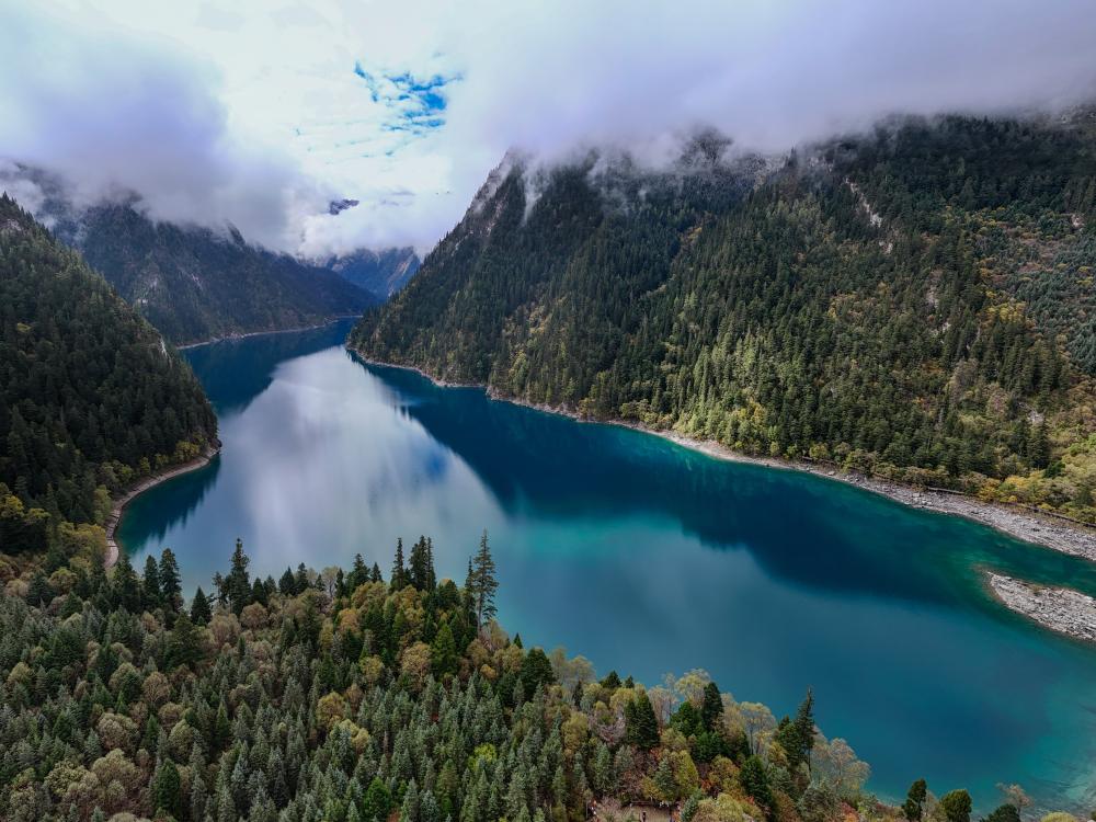 從高空中俯瞰,樹正溝、日則溝和則查洼溝3條主溝呈不規(guī)則的“Y”字形躺臥于九寨溝起伏的峰巒之間。數(shù)以萬計的游客散落在綿延40多公里的狹長溝谷內(nèi),卻并不顯得擁擠。
