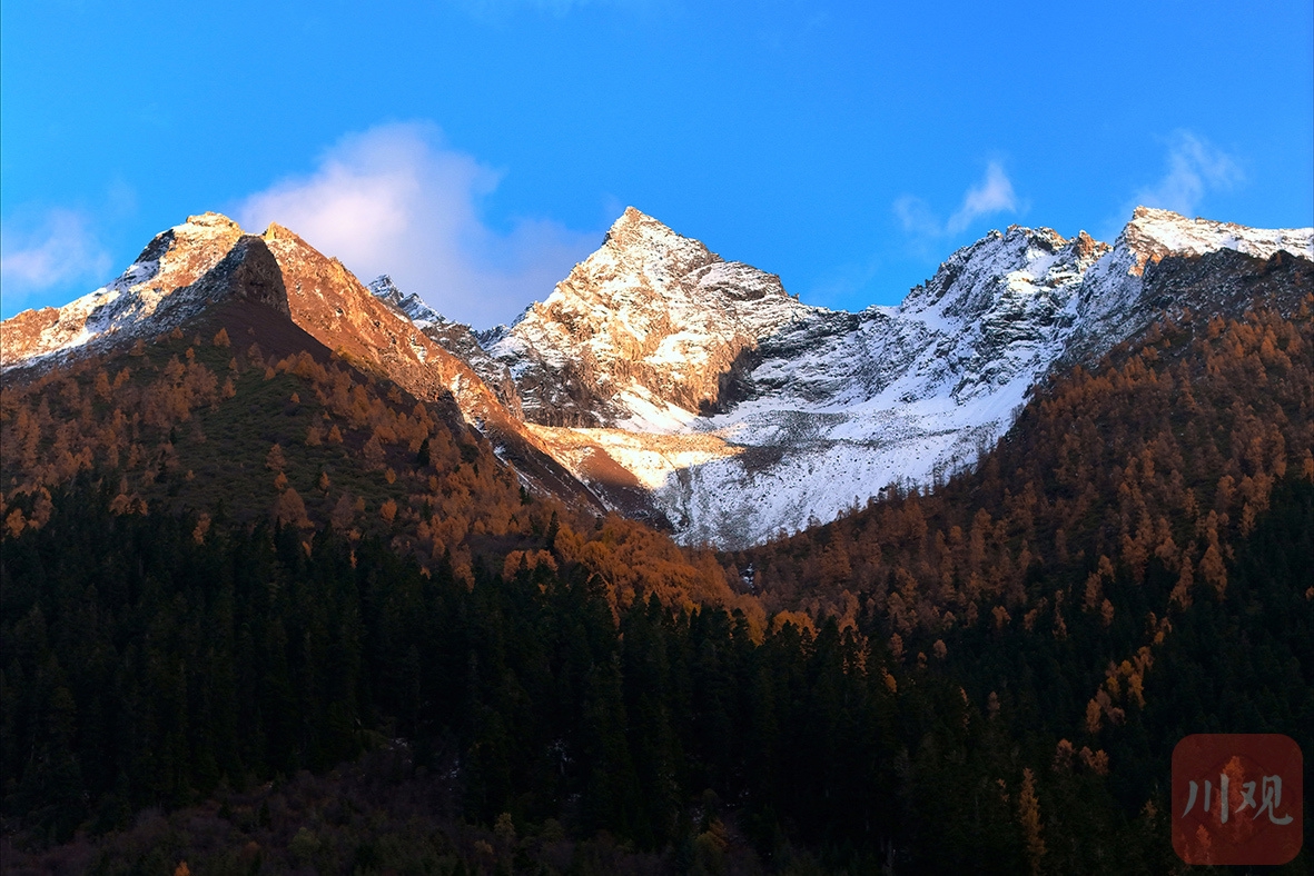 瑪嘉溝里,初冬仍有金秋余韻,金黃與火紅交織成樹木的盛裝。溪流潺潺,倒映著山色,樹葉如雪花飄落,鋪在小徑上,腳步踏上去沙沙作響,山陰處有初雪;行徑在夢筆山理小路,沿小路前行別具風(fēng)情,仿佛能穿越時空。初雪覆蓋的山巒在陽光下閃耀金光,與青稞田構(gòu)成一幅絕美的田園風(fēng)光。