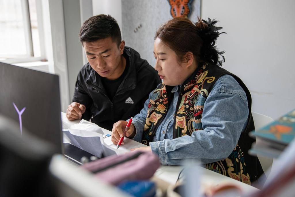 在四川省甘孜藏族自治州巴塘縣,劉莎莎在巴塘縣社會(huì)力量發(fā)展中心集群內(nèi)的辦公室與同事討論工作(11月5日攝)。