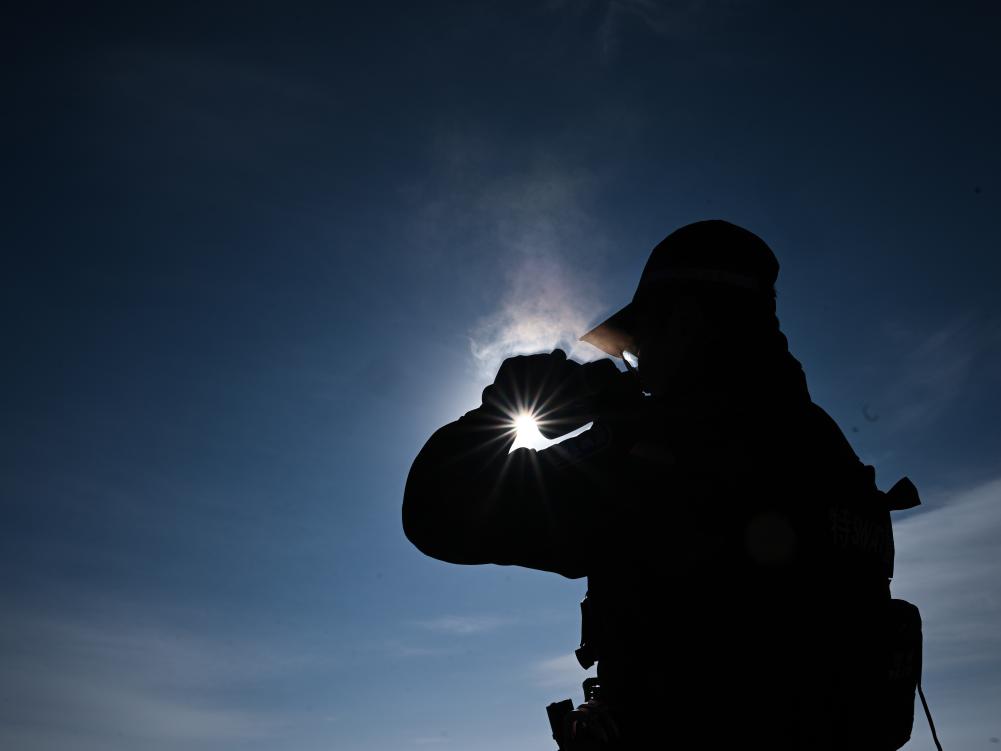 迎著凜冽的寒風(fēng),湖岸線上一列四人前行的身影逐漸清晰,厚實的皮鞋踩在積冰上咔哧作響。打頭的是青海省海北藏族自治州剛察縣青海湖派出所民警俄吾,他身負(fù)執(zhí)法記錄儀、望遠(yuǎn)鏡、警棍等全套裝備,不時停下腳步拿起望遠(yuǎn)鏡觀察周邊的情況。