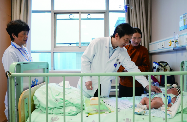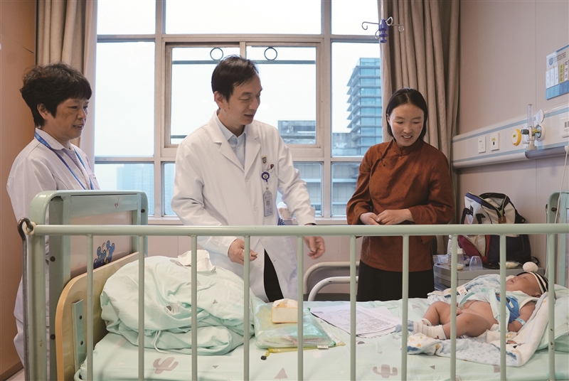 溫醫(yī)大附二院、育英兒童醫(yī)院兒童普通外科/新生兒外科主任朱利斌等醫(yī)護(hù)人員到病房了解小崗的身體狀況。王誠 攝
