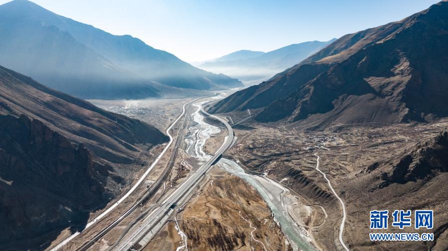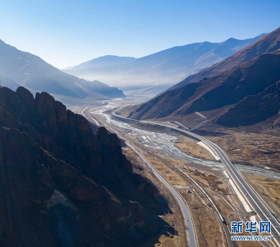 這是拉薩至那曲間的交通線路(1月28日攝,無人機照片)。從左到右依次為109國道、青藏鐵路、高等級公路。新華社記者 孫非 攝