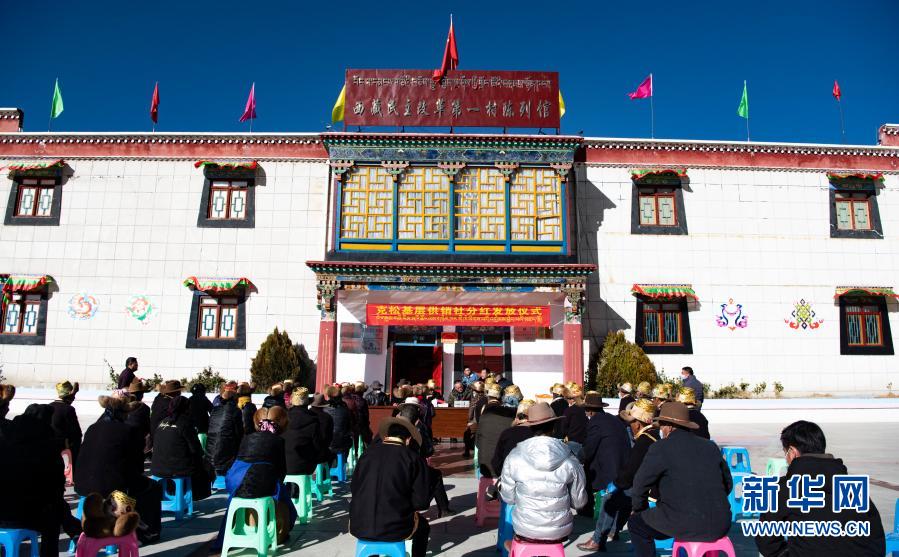 2月9日,西藏自治區(qū)供銷合作社社有企業(yè)——西藏領(lǐng)峰田舍益家公司負責人趙全(左一)給當?shù)厝罕姲l(fā)放分紅。新華社記者 普布扎西 攝