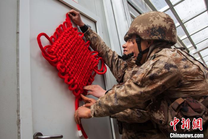 該旅官兵正在用中國(guó)結(jié)點(diǎn)綴裝飾保溫方艙。 王述東 攝