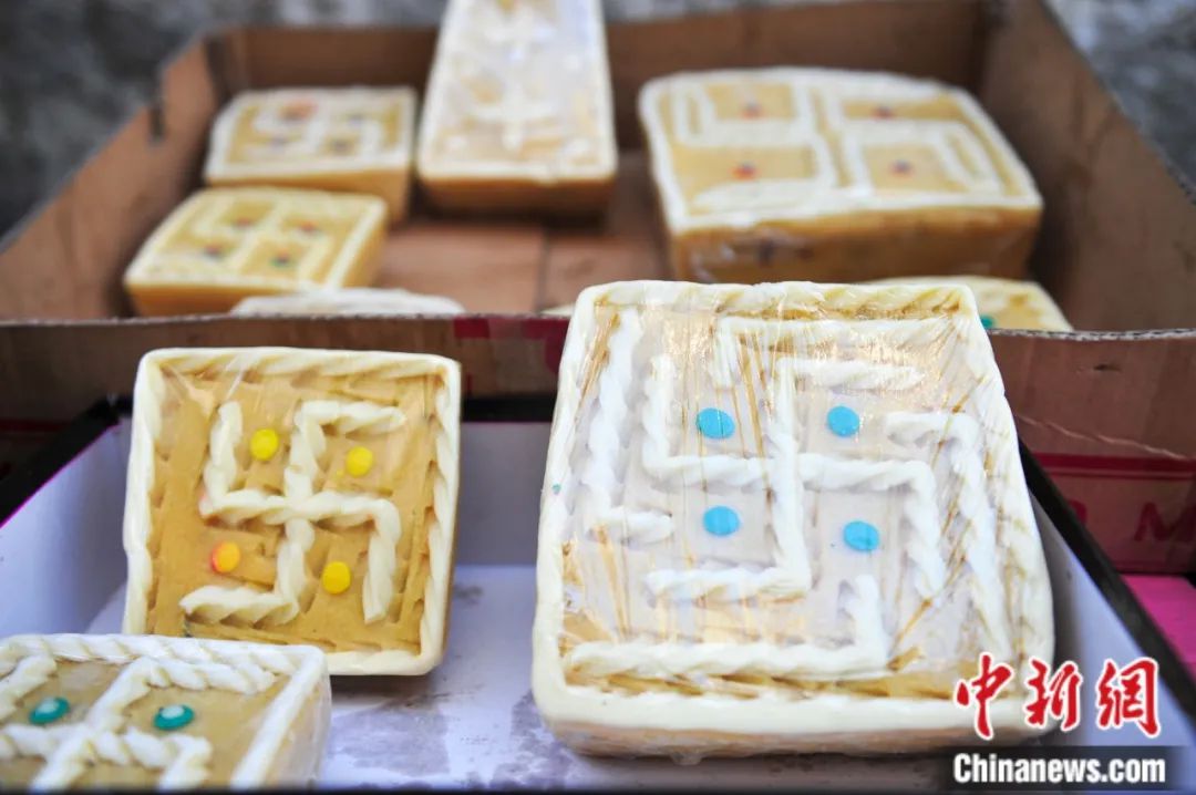 據(jù)悉,“推”是一種用奶渣粉、紅糖、酥油等混合制作的傳統(tǒng)食物,表面畫有“萬”字符,寓意吉祥。