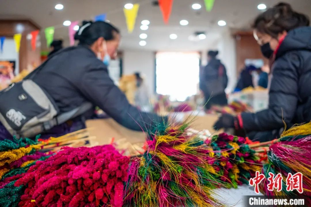 藏歷新年前,在拉薩市城關(guān)區(qū)拉魯社區(qū)、城關(guān)花園等地,不少農(nóng)牧民提前1月左右開始縫制五彩經(jīng)幡進(jìn)行銷售,當(dāng)五彩經(jīng)幡“臨時(shí)市場(chǎng)”形成了,則預(yù)示著藏歷新年的“腳步”越來越近了。