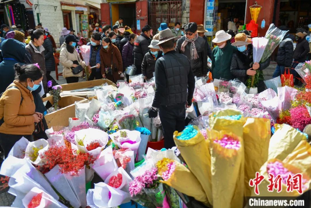 拉薩民眾在年貨市場(chǎng)購買鮮花。江飛波 攝