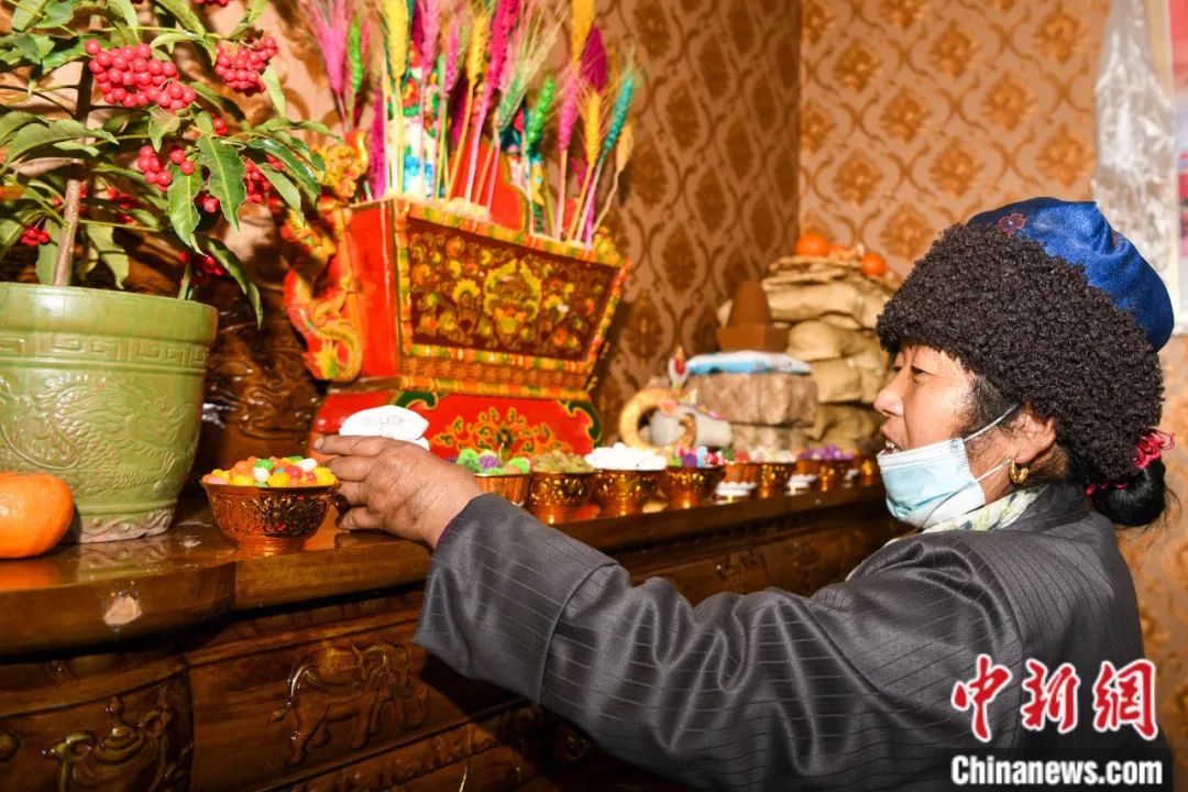 藏歷新年初一,人們?cè)谇鞋敽欣镅b滿用酥油拌好的糌粑和青稞,再插上酥油花、藏年花,大家互相拜年互道吉祥。