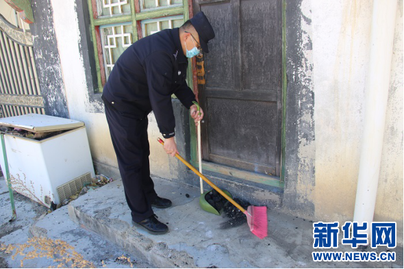 西藏出入境邊檢總站執(zhí)法調(diào)查支隊(duì)六隊(duì)民警清掃街道(3月4日攝)。新華網(wǎng)發(fā) 代旭攝
