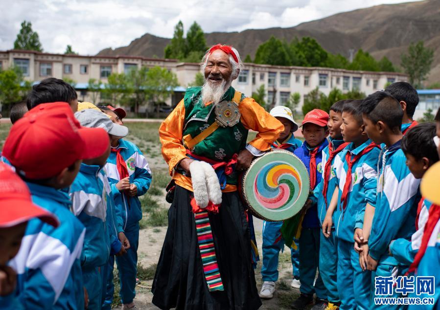 “久河卓舞”傳承人尼瑪(中)在瓊結縣下水鄉(xiāng)小學進行教學表演前的準備工作(2020年7月2日攝)。新華社記者 普布扎西 攝