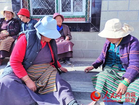 寬闊整潔的村道旁楊柳已吐出嫩芽,迎著陽光生機(jī)勃發(fā)。幾位老人坐在家門口曬著太陽玩“阿布朵”(擲石子),笑容始終掛在臉上。