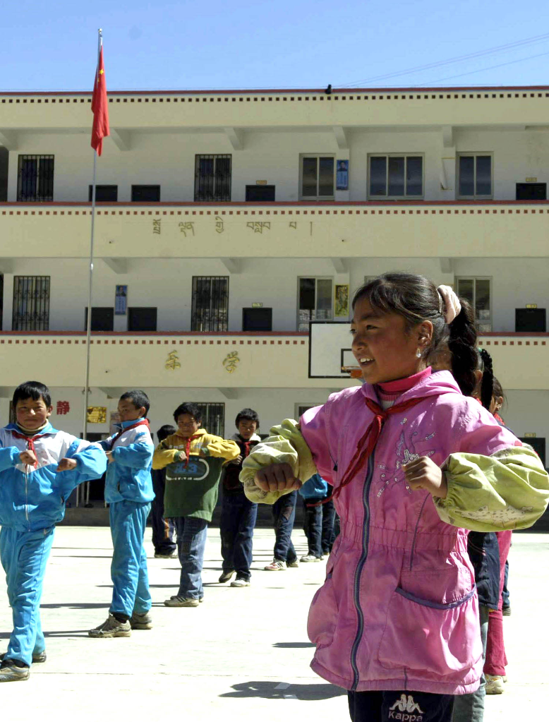 2008年4月16日,四川省阿壩藏族羌族自治州壤塘縣南木達易地育人學校的學生在上體育課。 新華社記者海明威 攝