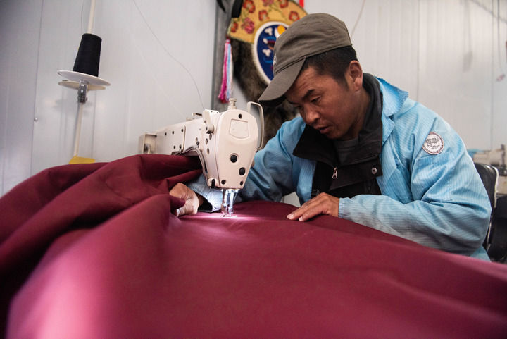 走進(jìn)廠房,只能聽見縫紉機(jī)轉(zhuǎn)動(dòng)的聲音。平措占堆坐在縫紉機(jī)前,雙眼盯著跳動(dòng)的針頭,手推深紅色布料伸展開去,這是制作藏式門簾的步驟之一。