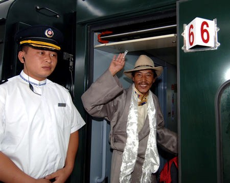 2006年7月1日,第一位檢票登車的乘客——來(lái)自拉薩柳梧鄉(xiāng)的達(dá)瓦桑布——登上慶典列車后向站臺(tái)上的人們揮手。