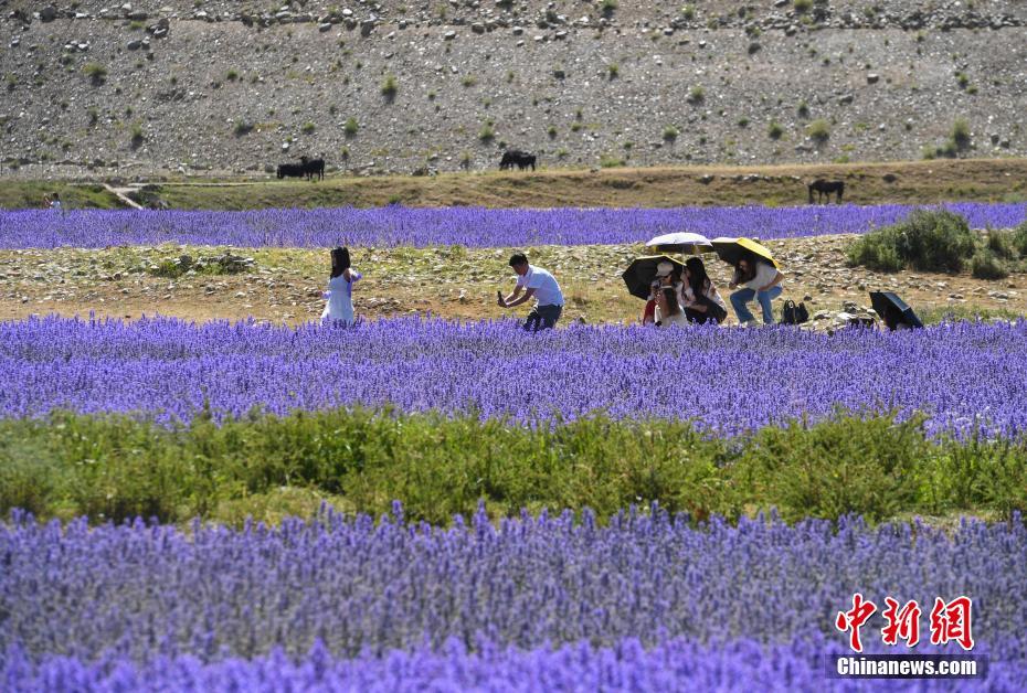 6月25日,位于西藏自治區(qū)拉薩市達(dá)孜區(qū)新倉(cāng)村貝拉莊園的100畝薰衣草花海競(jìng)相綻放,吸引不少游客和當(dāng)?shù)厥忻袂皝?lái)游玩、拍照。中新社記者 貢嘎來(lái)松 攝
