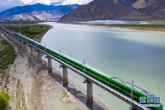 試運(yùn)行的復(fù)興號(hào)列車(chē)行駛在雅魯藏布江上(6月16日攝,無(wú)人機(jī)照片)。新華社記者 普布扎西 攝