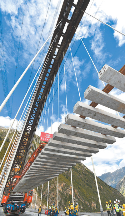 2020年9月20日,中鐵十一局工程技術(shù)人員在拉林鐵路藏木特大橋上鋪軌。新華社記者 覺(jué) 果攝