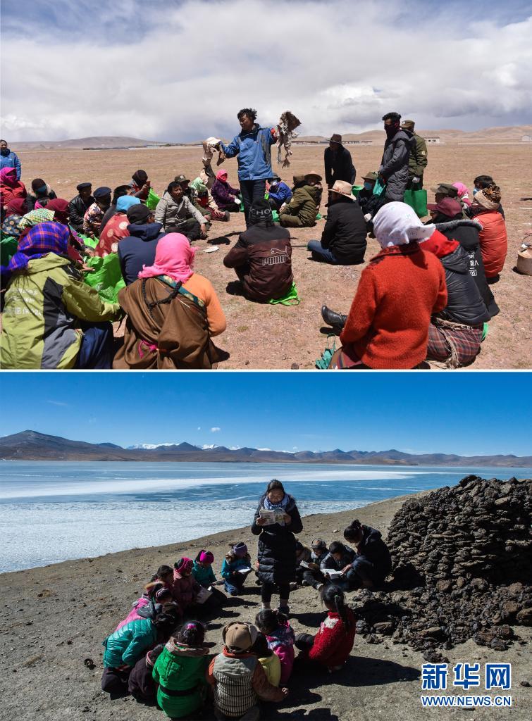 這是一張拼版照片:上圖為瑪曲鄉(xiāng)黨委書(shū)記朗卡江村(中)向參加活動(dòng)的村民講解如何區(qū)分可回收垃圾與不可回收垃圾(2019年5月28日攝,新華社記者周錦帥攝);下圖為在海拔約5000米的西藏山南市浪卡子縣堆瓦村,駐村工作隊(duì)員貢曲(中)和次仁倉(cāng)決(右一)給放假的孩子補(bǔ)習(xí)功課(2017年2月9日攝,新華社記者普布扎西攝)。新華社發(fā)