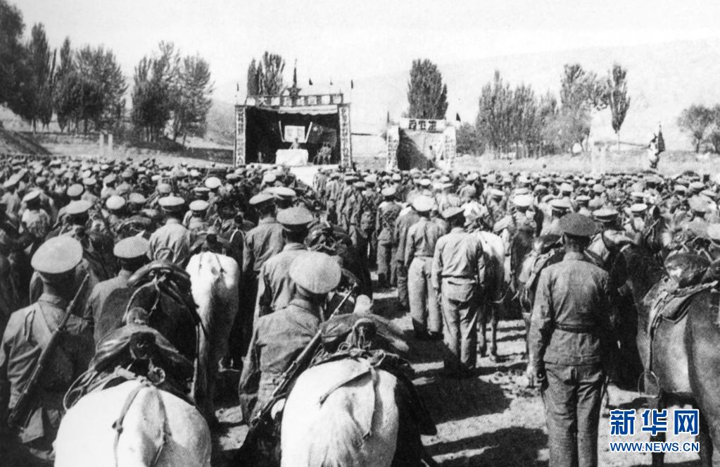 獨立騎兵師一團在新疆于田縣普魯村召開進藏誓師大會(資料照片)。新華社發(fā)(進藏英雄先遣連紀念館供圖)