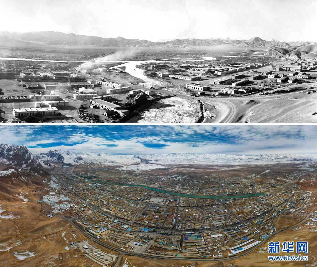 拼版照片:上圖是20世紀(jì)70年代的阿里獅泉河風(fēng)貌(新華社記者徐邦攝);下圖是2021年5月21日拍攝的阿里獅泉河鎮(zhèn)新貌(新華社記者孫瑞博攝,無人機(jī)全景照片)。新華社發(fā)