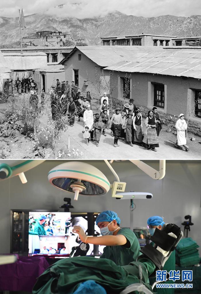 拼版照片:上圖是20世紀(jì)50年代,前往拉薩市人民醫(yī)院看病的藏族群眾在護(hù)士陪同下到醫(yī)療室去就診(新華社記者任用昭攝);下圖是2021年4月19日,拉薩市人民醫(yī)院骨科醫(yī)生通過5G通信技術(shù),在北京積水潭醫(yī)院專家遠(yuǎn)程指導(dǎo)下使用骨科機(jī)器人開展手術(shù)(新華社記者孫瑞博攝)。新華社發(fā)