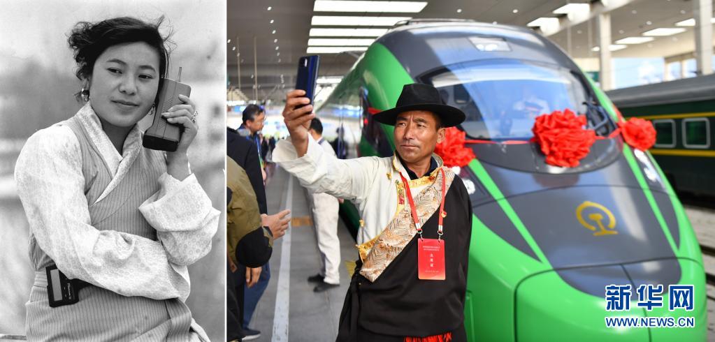 拼版照片:左圖是1994年,腰掛BP機(jī)、手持“大哥大”的藏族女商人拉珍和四川的客戶洽談生意(新華社記者土登攝);右圖是2021年6月25日,乘客與西藏首條電氣化鐵路拉林鐵路上的復(fù)興號(hào)列車自拍合影(新華社記者晉美多吉攝)。新華社發(fā)