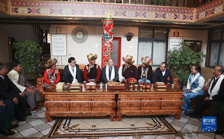 8月20日,中央代表團山南、日喀則分團帶著以習近平同志為核心的黨中央的深切關(guān)懷和全國人民的深情祝福,分別看望慰問當?shù)馗髯甯鹘绺刹咳罕?。這是中共中央書記處書記、中央統(tǒng)戰(zhàn)部部長、中央代表團副團長尤權(quán)率山南分團在山南市乃東區(qū)昌珠鎮(zhèn)扎西曲登社區(qū)走進居民次仁家看望慰問。新華社記者 丁林 攝