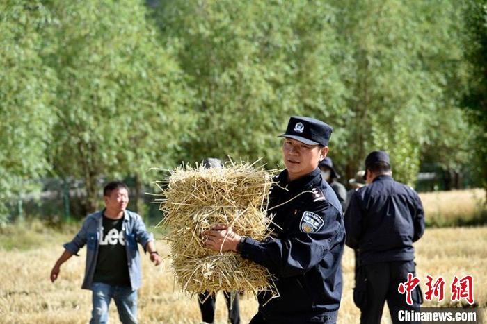 一陣忙碌過后,大家圍攏在田里聊變化說發(fā)展。慶祝西藏和平解放70周年大會(huì)剛剛舉行,大家聊著現(xiàn)場(chǎng)觀禮、收聽收看的感受。參加現(xiàn)場(chǎng)大會(huì)的民警高揚(yáng)向大家分享現(xiàn)場(chǎng)感受,講述自己在西藏生活學(xué)習(xí)工作22年的發(fā)展變化和入警初心。歡聲笑語過后,大家又忙碌起來。田間地頭藏青藍(lán)的身影,與金黃麥地構(gòu)成一幅加強(qiáng)民族團(tuán)結(jié)、警民魚水情深的動(dòng)人畫卷。