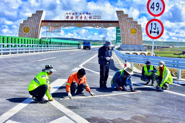 工人在畫路標。人民網(wǎng) 李海霞攝