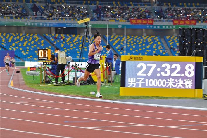 在同日進(jìn)行的田徑項(xiàng)目男子10000米決賽中,西藏自治區(qū)選手多布杰、索朗才仁、旦木真次旺參賽。經(jīng)過激烈鏖戰(zhàn),多布杰以28分35秒24的成績力壓群雄,勇奪冠軍,為西藏奪得本屆全運(yùn)會(huì)第二金,蟬聯(lián)兩屆全運(yùn)會(huì)該項(xiàng)目的冠軍。旦木真次旺和索朗才仁分別獲得了第四、第七名的好成績。