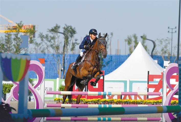 西藏自治區(qū)選手在進(jìn)行馬術(shù)三項(xiàng)賽團(tuán)體賽的最后一項(xiàng)比賽場(chǎng)地障礙賽。