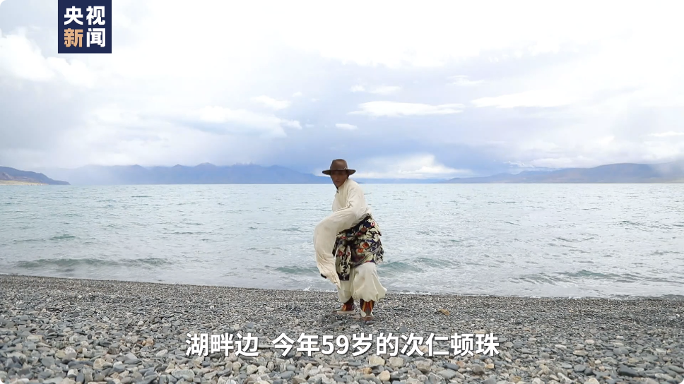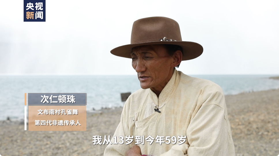 湖畔邊,今年59歲的次仁頓珠,穿著傳統的服飾,甩起長長的白袖,跳起了從先輩那里傳承下來的孔雀舞。