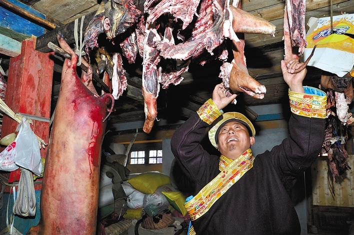 林芝市米林縣羌納鄉(xiāng)結果村村民旺杰在查看風干肉晾制情況。王雅慧 攝