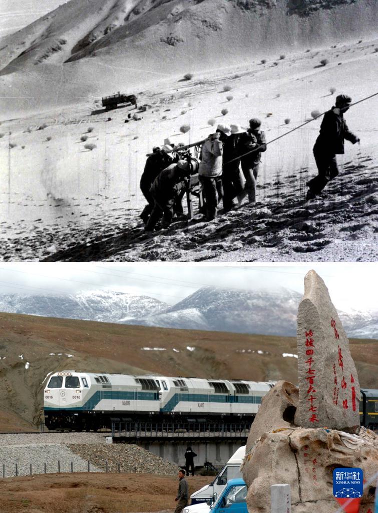 拼版照片:上圖為20世紀(jì)50年代拍攝的勘測(cè)青藏線(xiàn)的資料照片;下圖為2006年7月1日,青藏鐵路全線(xiàn)通車(chē)。這是從格爾木出發(fā)的“青1”次列車(chē)經(jīng)過(guò)海拔4767米的昆侖山口(新華社記者侯德強(qiáng)攝)。新華社發(fā)