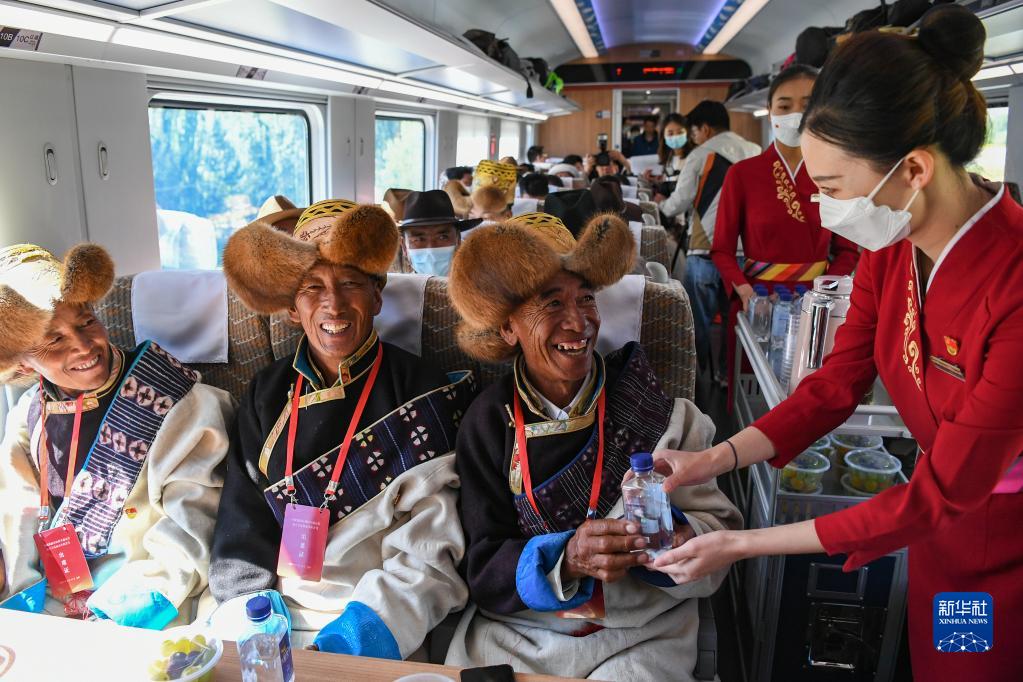 2021年6月25日,全長(zhǎng)435公里、設(shè)計(jì)時(shí)速160公里的拉林鐵路建成通車(chē),西藏首條電氣化鐵路建成,同時(shí)復(fù)興號(hào)實(shí)現(xiàn)對(duì)31個(gè)省區(qū)市全覆蓋。這是6月25日列車(chē)員向乘坐首趟復(fù)興號(hào)高原內(nèi)電雙源動(dòng)車(chē)組的乘客遞水。新華社記者 普布扎西 攝