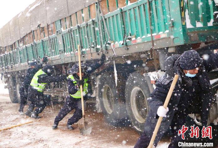 圖為2021年4月,國(guó)道109線安多段大雪致車(chē)輛通行困難,那曲市安多縣公安民警進(jìn)行除雪保通。資料圖 西藏自治區(qū)公安廳供圖