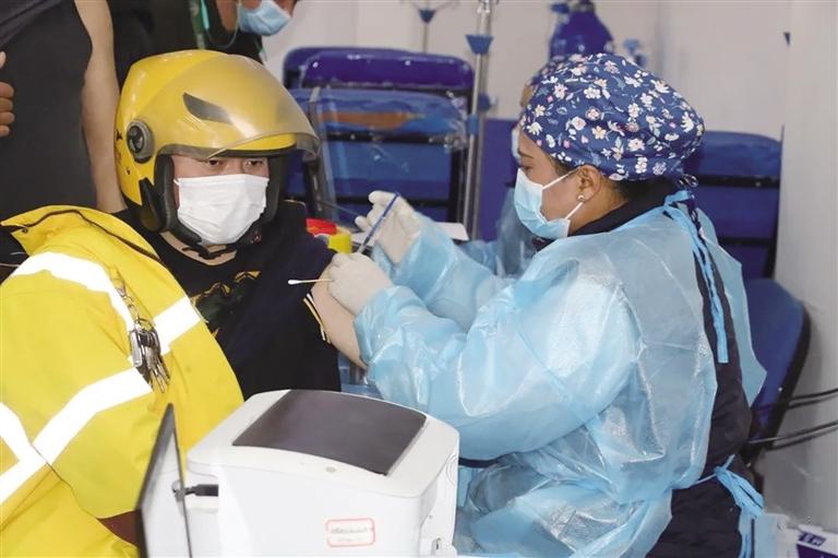 醫(yī)務(wù)人員為美團(tuán)外賣騎手接種第三針新冠疫苗。圖片來自拉薩工會(huì)微信公眾號(hào)