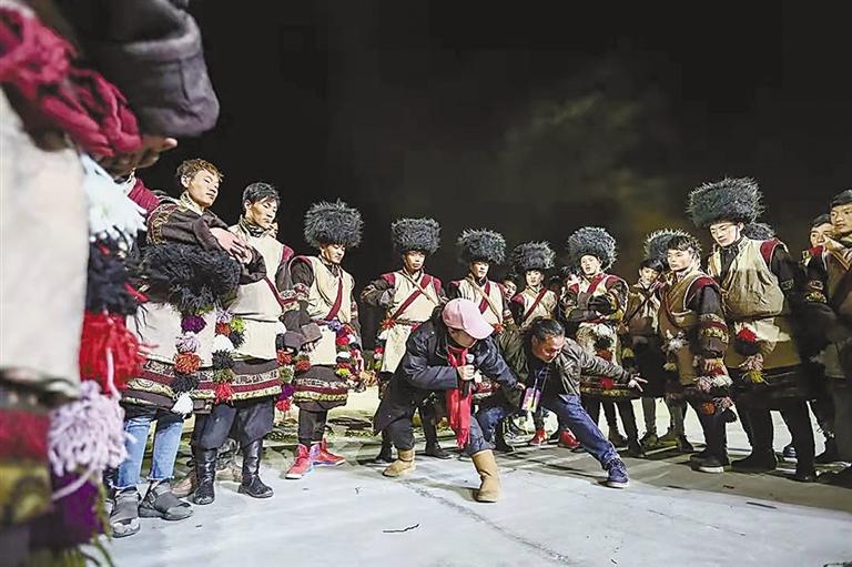 燈光放亮,音樂響起,史詩劇隨著夜色拉開了帷幕,雨中的百人鍋莊在敞亮的舞臺激蕩起千層水光,篝火升騰,染紅了半壁寶瓶山,齊整的“打阿嘎”的遁地之聲伴著夜雨更加氣勢如虹,泥水淹過了腳踝,沿著舞蹈動作的弧度在演員們的腳尖、衣袖間甩落出一條條數(shù)米長的水痕線,面對匍匐、跪拜、奔跑、磕長頭,甚至撲地打滾等舞蹈動作,他們沒有一絲遲疑,衣帽已與泥水混為一體,雨夜中,同進(jìn)退,共歌舞。