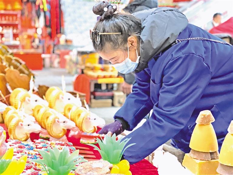 在雪域亙古浩瀚的歷史中,高原兒女自古以來便認定“羊”是吉祥的動物,代表了藏族群眾祈盼來年五谷豐登、六畜興旺。塑彩羊頭在藏語中稱為“隆果”,一般擺放在新年布置的貢品中央?!鞍謰屓ツ曩徺I了一種用石灰制作的塑彩羊頭,今年我想購買陶瓷制作的塑彩羊頭放在爸媽家,去年買的拿回自己家,這樣既環(huán)保,也讓老人開心?!笔忻袼骼释言谀曦洈偽毁徺I“隆果”時說。
