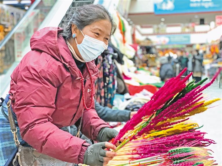 近年來,新春佳節(jié)貼“年紅”的傳統(tǒng)習俗日漸走進圣城雪域。如今,無論城市還是農(nóng)村,幾乎家家戶戶都會在門上貼藏文春聯(lián),增加喜慶的節(jié)日氣氛。來自墨竹工卡縣的平措卓瑪正在八廓商城年貨攤位前整理著春聯(lián),去年已經(jīng)擺過一次年貨攤位的她,在1個月的時間里掙到了8000元。“今年攤位抽簽時,心里特別緊張,怕位置不好,沒想到抽到了中間的好位置,這里采光足,紅彤彤的春聯(lián)在陽光下更好看了。新的一年,希望大家幸福安康、平安吉祥!”平措卓瑪懇切地說。