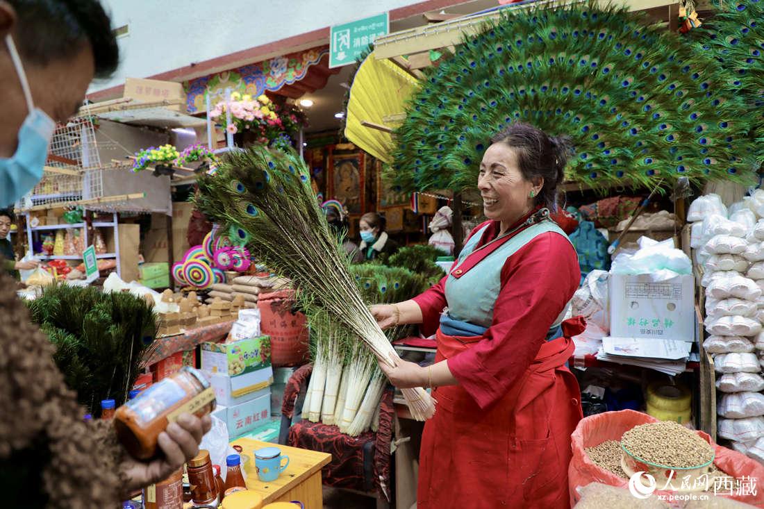 八廓商城一角售賣(mài)的 “羅薩美朵”。(每年的藏歷新年,家家戶戶的切瑪盒里都要插上 “羅薩美朵”,代表著溫馨的家庭里有著幸福的祝愿,承載著歡樂(lè)的故土上,能夠五谷豐登的期盼。)人民網(wǎng) 次仁羅布攝