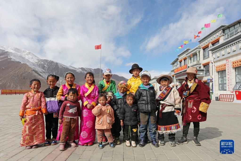 部分搬遷牧民家的孩子在搬遷點(diǎn)廣場上合影,他們當(dāng)中大一點(diǎn)的出生在榮瑪,最小的幾個(gè)出生在古榮(2月28日攝)。新華社記者 姜帆 攝
