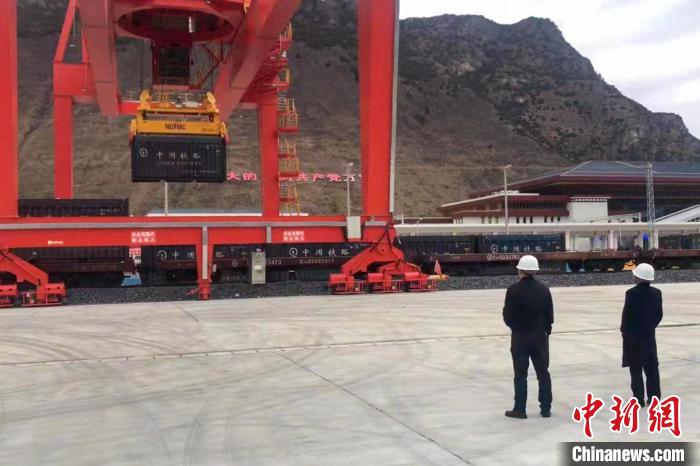 西藏林芝車站貨場對集裝箱進行接卸。格桑曲珍 攝