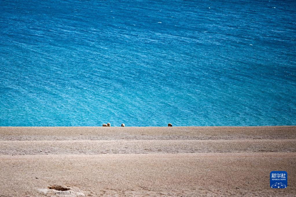 在位于西藏自治區(qū)那曲市的巴木錯(cuò),羊群在湖邊吃草(2022年4月13日攝,手機(jī)照片)。新華社記者 沈虹冰 攝