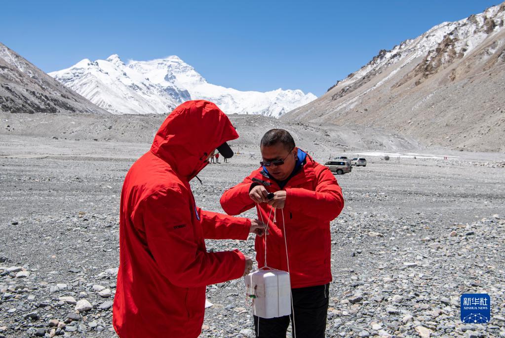 在珠峰登山大本營(yíng),科研人員檢查臭氧通量裝置運(yùn)行情況(5月3日攝)。新華社記者 姜帆 攝
