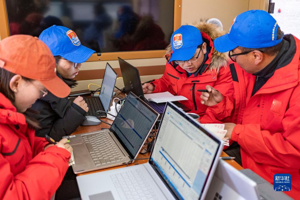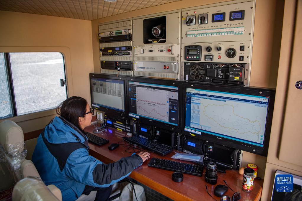 在珠峰登山大本營(yíng)的氣象應(yīng)急保障車(chē)內(nèi),西藏自治區(qū)氣象局工作人員在查看實(shí)時(shí)氣象數(shù)據(jù)(5月3日攝)。新華社記者 孫非 攝