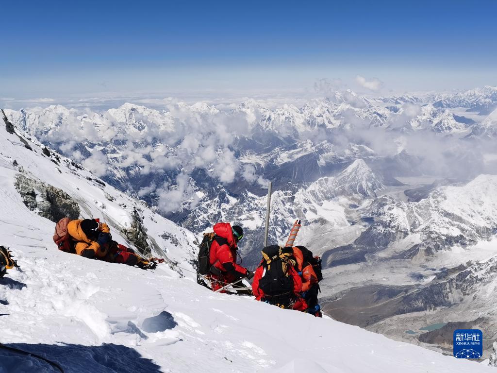 5月4日,科考隊(duì)員登上珠穆朗瑪峰峰頂。新華社特約記者 索朗多吉 攝