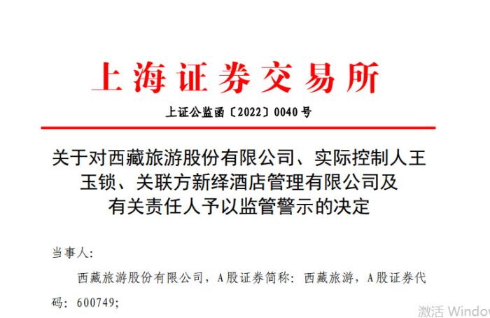 上交所表示,公司為實際控制人控制的企業(yè)代付款項,構(gòu)成非經(jīng)營性資金占用,且相關(guān)信息披露不真實、不準確。根據(jù)有關(guān)規(guī)定,對西藏旅游股份有限公司、實際控制人王玉鎖、關(guān)聯(lián)方新繹酒店管理有限公司及西藏旅游股份有限公司時任董事長趙金峰、時任 總經(jīng)理胡鋒、時任財務(wù)總監(jiān)兼董事會秘書羅練鷹、時任董事會秘書郝軍予以監(jiān)管警示。