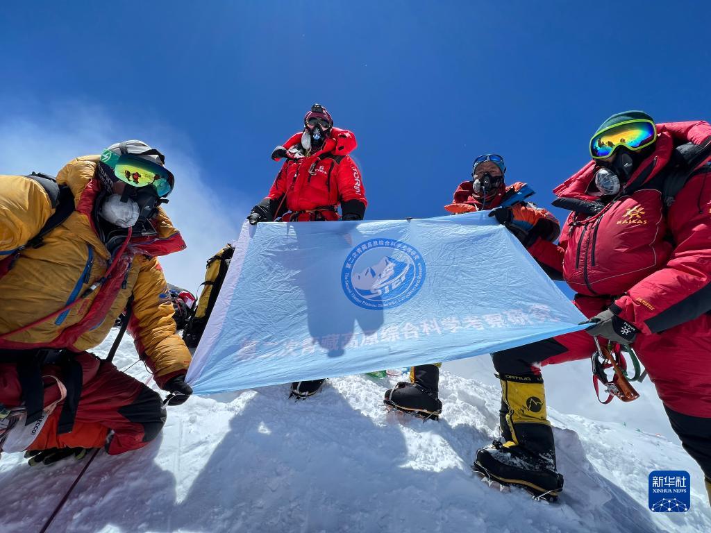在珠穆朗瑪峰峰頂,科考隊(duì)員展示第二次青藏高原綜合科學(xué)考察研究旗幟(5月4日攝)。新華社特約記者 索朗多吉 攝