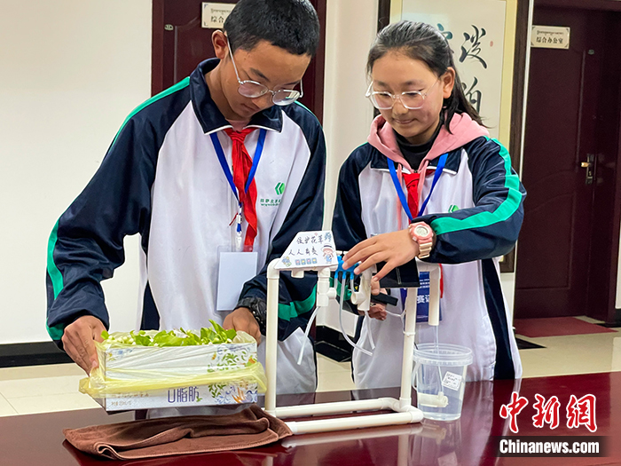 圖為智慧社區(qū)中學(xué)組參賽選手向評(píng)委老師展示作品《太陽(yáng)能自動(dòng)澆灌系統(tǒng)》的工作原理。 中新社記者 趙朗 攝